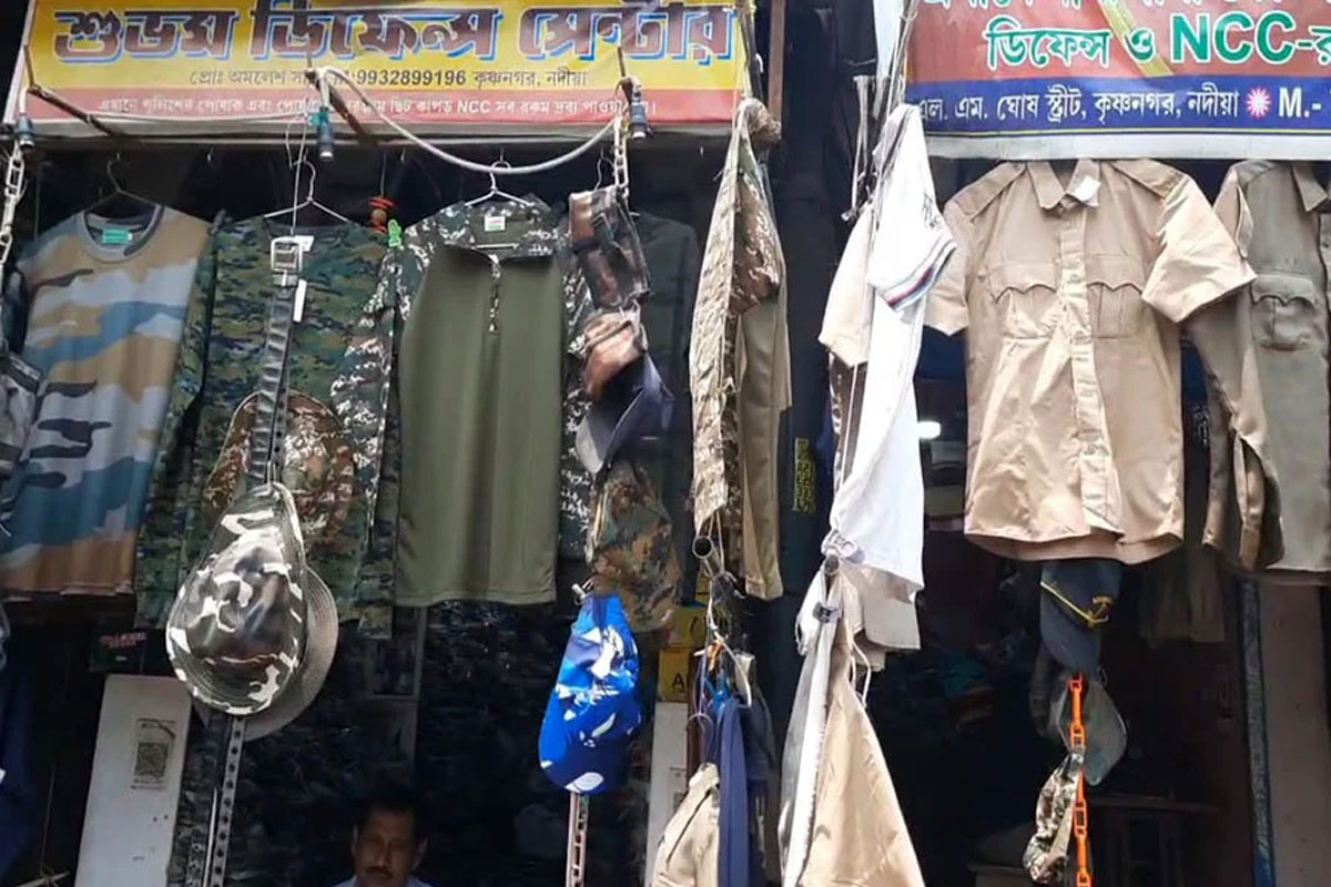 কৃষ্ণনগর পুলিশ লাইনের ঠিক উল্টোদিকেই এরকমই পাঁচ ছয়টি দোকান রয়েছে, যেখানে এই ধরনের পোশাক দেদার বিক্রি হচ্ছে। এই সব দোকানের সামনে ঝোলানো রয়েছে সেনার বিভিন্ন পোশাক। বিভিন্ন সংবাদ মাধ্যমে সেইসব দোকানের ছবি ভাইরালও হয়েছে। দৈনিক স্টেটসম্যানের পক্ষ থেকে এরকম একটি দোকানের মালিকের সঙ্গে কথা হয়। দোকানদারের নাম রতন সাহা। তিনি বলেন, আমাদের দোকানে শুধু রাজ্য পুলিশ এবং এনসিসি-র পোশাক পাওয়া যায়। সেনা বাহিনীর কোনও পোশাক পাওয়া যায় না। আমি শুধু এদেরকেই পোশাক বিক্রি করে থাকি। অন্য কেউ সাধারণ মানুষকে বিক্রি করে কিনা তা আমার জানা নেই। আমি নিজে কাপড় কাটিয়ে এই পোশাক বানিয়ে থাকি।’ দৈনিক স্টেটসম্যানের পক্ষ থেকে তাঁকে ফের প্রশ্ন করা হয়? ‘কীভাবে আপনারা বোঝেন, যাঁরা পোশাক কিনতে আসছেন, তাঁরা এনসিসি বা রাজ্য পুলিশের লোক?’