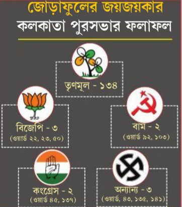 মঙ্গলবার কলকাতা পুরভোটের ফলাফল প্রকাশ হলে দেখা যায় সবুজ ঝড়ে উড়ে গিয়েছে বিরোধীরা। ‘ছোট লালবাড়ি’ দখলের ভোটে ১৩৪ টি আসন নিজেদের দখলে রেখেছে তৃণমূল।