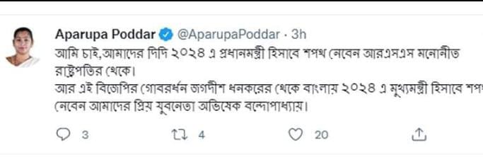 তবে মঙ্গলবার টুইট করে আগামী লোকসভা নির্বাচনে যে প্রধানমন্ত্রী হওয়ার একমাত্র মুখ মমতা বন্দ্যোপাধ্যায়, তা মনে করিয়ে দিয়ে টুইট করেন অপরূপা।