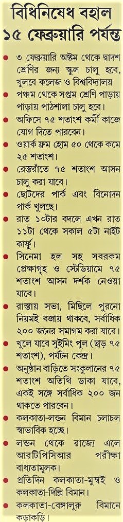সংক্রমণের হার কমায় আগেই বিধি কিছুটা শিথিল করেছিল নবান্ন। সোমবার বিধিতে আরও বেশ কিছুটা ছাড় দেওয়ার কথা আজ পয়লা ফেব্রুয়ারি থেকে ১৫ ফেব্রুয়ারি পর্যন্ত করে পরিস্থিতির পর্যালোচনা করা হবে বলে জানিয়ে দিলেন মমতা।