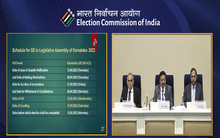 দিল্লি, ২৯ মার্চ – কর্নাটকে বিধানসভা ভোটের দিনক্ষণ ঘোষণা করে দিল নির্বাচন কমিশন । কর্ণাটক বিধানসভার ভোটপর্ব অনুষ্ঠিত হবে আগামী ১০ই মে, ফলাফল ঘোষণা করা হবে ১৩ই মে। কর্ণাটক বিধানসভার ২২৪ আসনের জন্য মোট ৫৮,২৮২ টি ভোটগ্রহণ কেন্দ্র স্থাপন করা হবে, ৫.২ কোটি ভোটার রাজ্যে তাদের ভোটাধিকার প্রয়োগ করবেন।মুখ্য নির্বাচন কমিশনার রাজীব কুমার এবং নির্বাচন কমিশনার অনুপ চন্দ্র পাণ্ডে ও অরুণ গোয়েল বুধবার সাংবাদিক বৈঠক করে এই রাজ্যের ভোট ঘোষণা করেন।