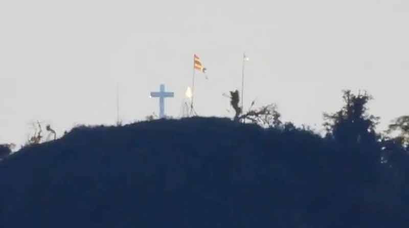 এক সর্বভারতীয় সংবাদমাধ্যম সূত্রে খবর, মেতেই সম্প্রদায়ের কাছে অত্যন্ত পবিত্র থাংটিং পাহাড়ে একটি বিশালাকৃতি ক্রুশ পুঁতে দেওয়া হয়। তার পরই পাশে উড়তে দেখা যায় একটি বিতর্কিত পতাকা। স্থানীয়দের দাবি, ঝান্ডাটি কুকি জঙ্গি সংগঠেনর। এই ঘটনায় ফের শোরগোল পড়েছে হিংসাদীর্ণ রাজ্যটিতে।