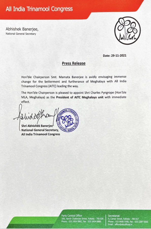 তার সঙ্গে উত্তর-পূর্ব ভারতের মেঘালয়েও সর্ব ভারতীয় তৃণমূল কংগ্রেসের মেঘালয় শাখার প্রেসিডেন্ট হিসেবে শ্রী চার্লস পিংগ্রোপকে নিযুক্ত করা হয়েছে এবং মেঘালয়ে অবিলম্বে তিনি কাজ শুরু করবেন। এমনটাই একটি বিজ্ঞপ্তির দ্বারা সর্বভারতীয় তৃণমূল কংগ্রেসের টুইটার অ্যাকাউন্টে জানানো হয়েছে।