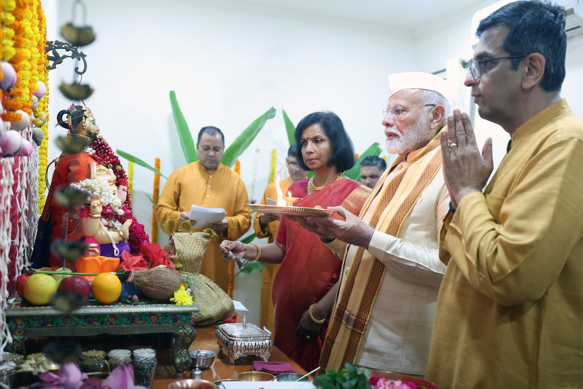ক্রিম রঙের কুর্তা-পাঞ্জাবি, গলায় চাদরের সঙ্গে ঐতিহ্যবাহী মহারাষ্ট্রীয় টুপি পরে ডিওয়াই চন্দ্রচূড় ও তাঁর স্ত্রীর সঙ্গে আরতি করেন মোদী। প্রধানমন্ত্রী এক্স হ্যান্ডলে ভিডিও পোস্ট করে লিখেছেন, প্রধান বিচারপতি ডিওয়াই চন্দ্রচূড়জির বাসভবনে গণেশ পূজায় যোগ দিয়েছি। ভগবান শ্রী গণেশ আমাদের সকলকে সুখ, সমৃদ্ধি এবং সু-স্বাস্থ্যের আশীর্বাদ করুন।