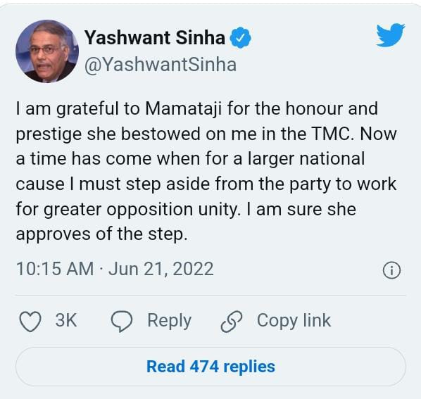 বিরোধীদের রাষ্ট্রপতি নির্বাচনের প্রার্থী হিসাবে যার নাম তৃণমূলের তরফ থেকে প্রস্তাব করার কথা। সেই যশবন্ত সিনহাই আচমকা দল ছাড়ার কথা ঘোষনা করলেন।