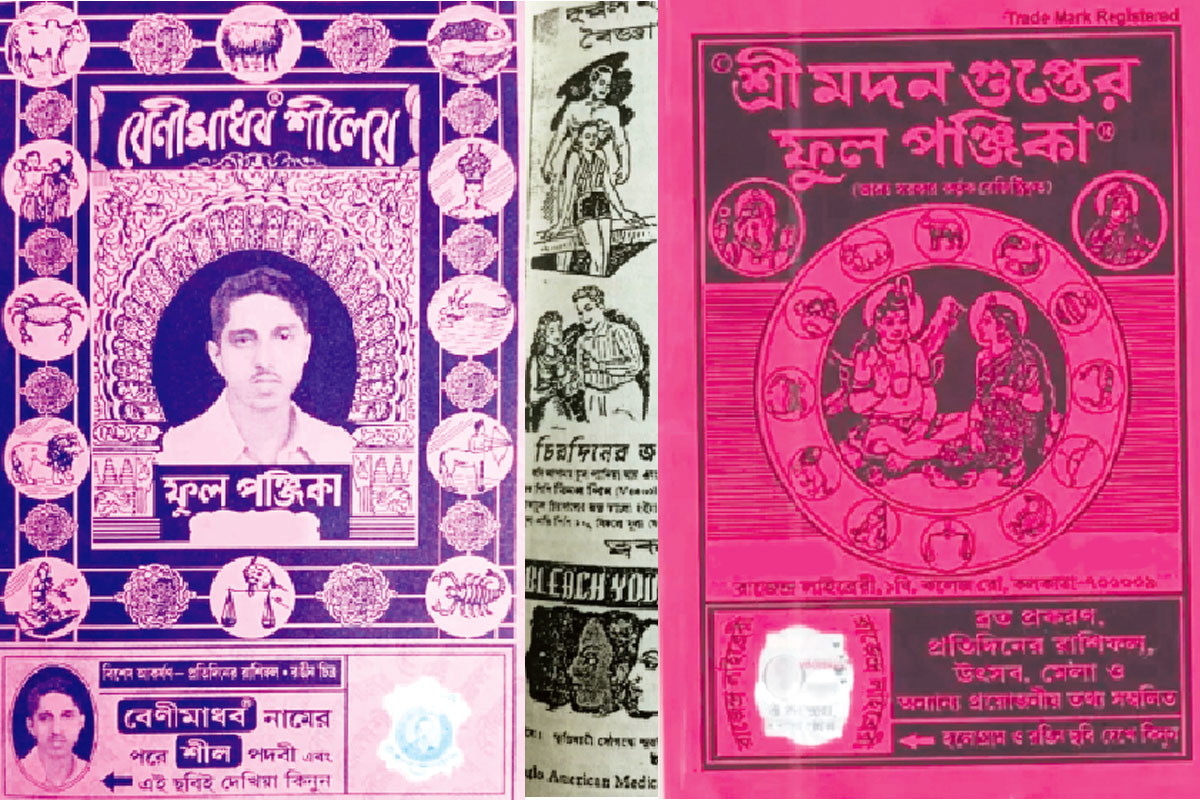শুধু তাই নয়, পুরোনো পঞ্জিকার পাতায় দেখা যায় হাতঘড়ি, অস্ত্রশস্ত্র এমনকি ‘পকেট ফ্যান’-এর বিজ্ঞাপন৷ যেমন, ‘জার্ম্মান হইতে নূতন পকেটফ্যান আমদানি করিয়াছি৷ এই দারুণ গ্রীষ্মে বৈঠকখানা ও শুভবিবাহে ১টী পকেটফ্যান রাখিলে অন্য কোন পাখার আবশ্যক হয় না৷ মূল্য দুই টাকা, মাশুল ছয় আনা৷’ এভাবে দৈনন্দিন অবশ্য প্রয়োজনীয়, নতুনতর পণ্যের সঙ্গে পরিচয় ঘটানোর ক্ষেত্রে পঞ্জিকার ভূমিকা অপরিসীম৷ প্রত্যক্ষ উপযোগের তালিকা করলে দেখা যাবে, নানারকম পেটেন্ট ওষুধ, নকল গয়না, হোমিওপ্যাথি ওষুধ, ক্রীড়া সামগ্রী, কবিরাজি ওষুধ, মাথার সুগন্ধী তেল, কলম, ছিপ, ঘডি় এমনকি বিভিন্ন নার্শারির বিজ্ঞাপন পঞ্জিকার পাতায় লক্ষ্য করা যায়৷ শাকসবজি, বই কিংবা খেলাধূলার সামগ্রীর বিজ্ঞাপনও অতীতকালের পঞ্জিকায় দেখা মিলত৷ পেটেন্ট ওষুধ, বহু পরীক্ষার কষ্টিপাথর টপকানো ওষুধ থেকে স্বপ্নে পাওয়া ওষুধ পর্যন্ত এখানে আছে৷ সেকালের দুই ওষুধ-প্রস্তুতকারক প্রতিষ্ঠান ‘বটকৃষ্ণ পাল অ্যান্ড কোং’ ও ‘ডি গুপ্ত অ্যান্ড কোং’ নিজেদের পণ্যের প্রচারের বাহন হিসেবে পেশাদার প্রকাশকদের সঙ্গে পাল্লা দিয়ে বিজ্ঞাপনময় পঞ্জিকা ছাপানো শুরু করেছিলেন৷ এই ঘটনা থেকেই বোঝা যায়, তখন পঞ্জিকা অদ্ভুত সব বিজ্ঞাপনের সমাহারের জন্য জনগণের কাছে কতটাই না আকর্ষণীয় হয়ে উঠেছিল৷