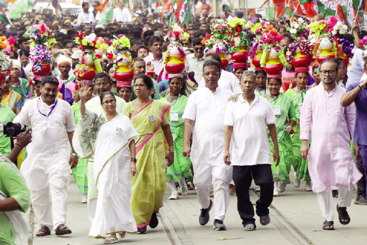 নিজস্ব প্রতিনিধি — একেই বলে পথ এক, মত আলাদা৷ এক যাত্রায় পৃথক ফল ফলল চব্বিশ ঘন্টার মধ্যে৷ শ্যামবাজার থেকে স্বামীজির বাড়ি — মঙ্গলবার এই পথ দিয়েই গাড়ির ওপর উঠে রোড শো করেছিলেন প্রধানমন্ত্রী নরেন্দ্র মোদি৷ তারপর চব্বিশ ঘন্টাও কাটেনি৷ সেই একই পথ ধরে শ্যামবাজার থেকে সিমলা স্ট্রিট ধরে পায়ে হেঁটে সেই একই গন্তব্যে স্বামীজির বাড়ি পৌঁছলেন মমতা বন্দ্যোপাধ্যায় তথা রাজ্যের মুখ্যমন্ত্রী মমতা বন্দ্যোপাধ্যায়৷ এই মুহূর্তে যাঁরা যথাক্রমে কেন্দ্রের শাসক ও বিরোধী ‘ইন্ডিয়া’ দলের সদস্য৷ বুধবার সকালেই বারুইপুরের মঞ্চ থেকে মমতা স্পষ্ট করেছিলেন, শ্যামবাজারে সভা করার কথা ছিল না৷ মোদির মিথ্যাচারের জবাব দিতেই ওখানে যাব৷ এমনকী বুধবারের শেষ সভা মেটিয়াবুরুজের সভাতেও মমতা বার্তা দিয়েছেন, মোদিজি মঙ্গলবার যেখানে মিছিল করেছেন, সেখানে মিছিল করলাম৷ মোদিজি রাজনীতি করতে গিয়েছিলেন, আমি গিয়েছিলাম নেতাজিকে স্যালুট জানাতে আর মোদির মিথ্যাচারের প্রতিবাদ করতে৷ এদিন শ্যামবাজার থেকে পদযাত্রার শেষে সুদীপ-কুণালকে কিছু নির্দেশ দিলেন তৃণমূল সুপ্রিমো৷