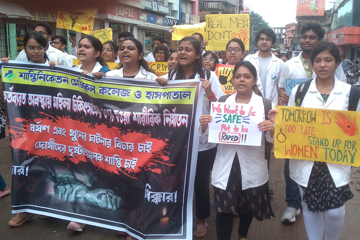 এদিকে ওই মহিলা চিকিৎসকের এভাবে মৃত্যুর ঘটনায় প্রতিবাদ শুরু হয়েছে বিভিন্ন জায়গায়। যা থেকে বাদ গেল না বোলপুর-শান্তিনিকেতন। শনিবার ১০ আগস্ট শান্তিনিকেতন মেডিক্যাল কলেজ ও হাসপাতালের ডাক্তারি পড়ুয়া ছাত্রছাত্রীরা মহিলা চিকিৎসকের নৃশংসভাবে হত্যার প্রতিবাদে বোলপুর চৌ-রাস্তা থেকে একটি ধিক্কার মিছিল বের করেন। তাঁদের হাতে সমস্ত ঘটনার তদন্ত এবং দোষীদের দৃষ্টান্তমূলক শাস্তির দাবিতে স্লোগান দেওয়া হয়। মিছিলটি শান্তিনিকেতনে গিয়ে শেষ হয়।